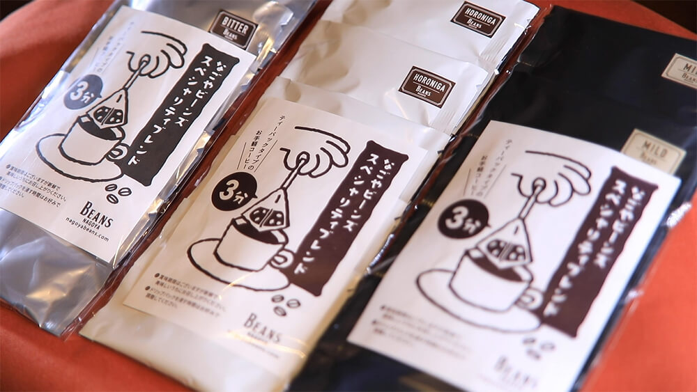 店主 20周年の記念に、これまで支えてくださったお客様への感謝として何か進呈できるものをと考えていた時、たまたま知人から「ドリップパックを作ってみたら?」とご提案いただいたんです。とはいえ、やっぱり専門店として味には決して妥協をしたくはなかった。パッケージにも「なごやビーンズスペシャリティコーヒー」と載せてあるように、ロットごとに豆を厳選し、ブレンドしています。お家でもかんたん手軽に、しかも本格的なコーヒーを楽しめるところがいちばんの魅力です。